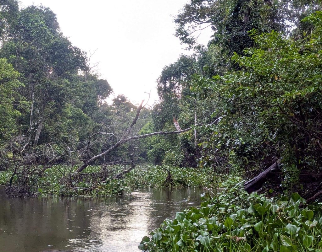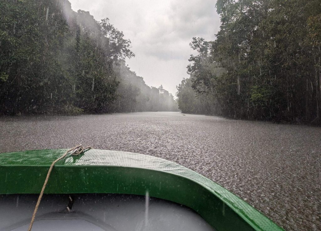 Back for lunch, and a little downtime. We got on the river early for the afternoon trip – 3 PM. We were going up-river to look for the elephants. We zipped up the river, not stopping for macaques or egrets. We got to the tributary where the elephants had been recently seen and turned up it. As soon as we headed in, the skies opened up and the rain came down hard.