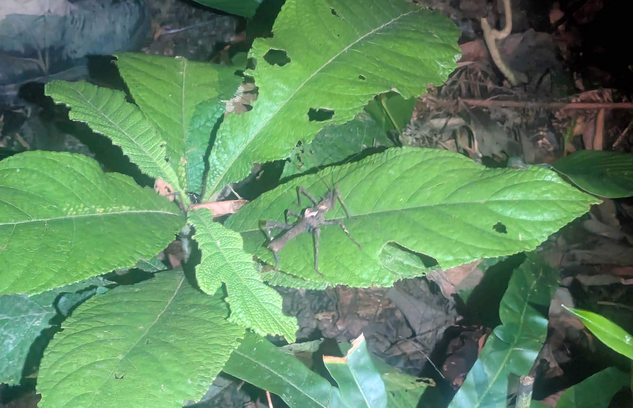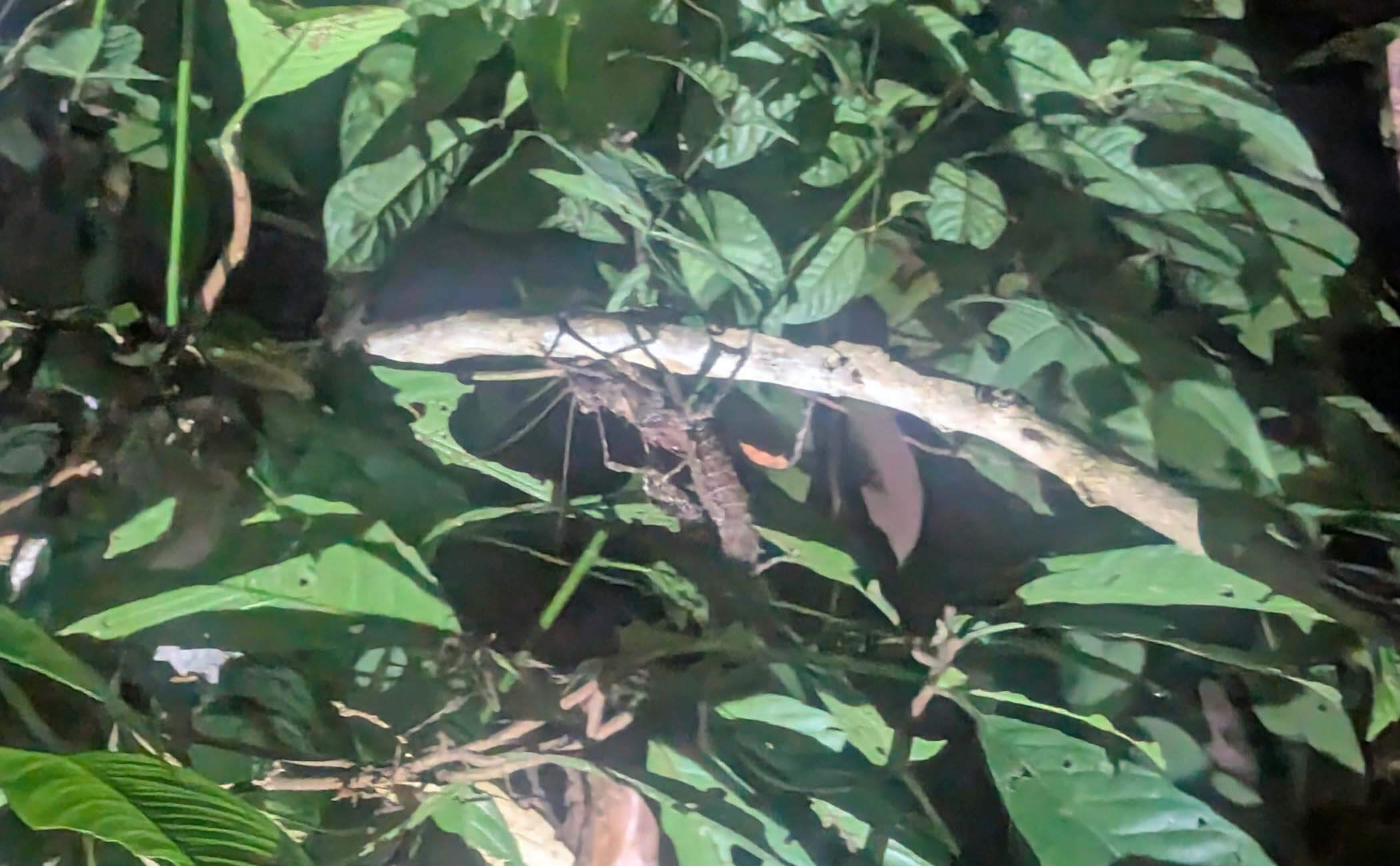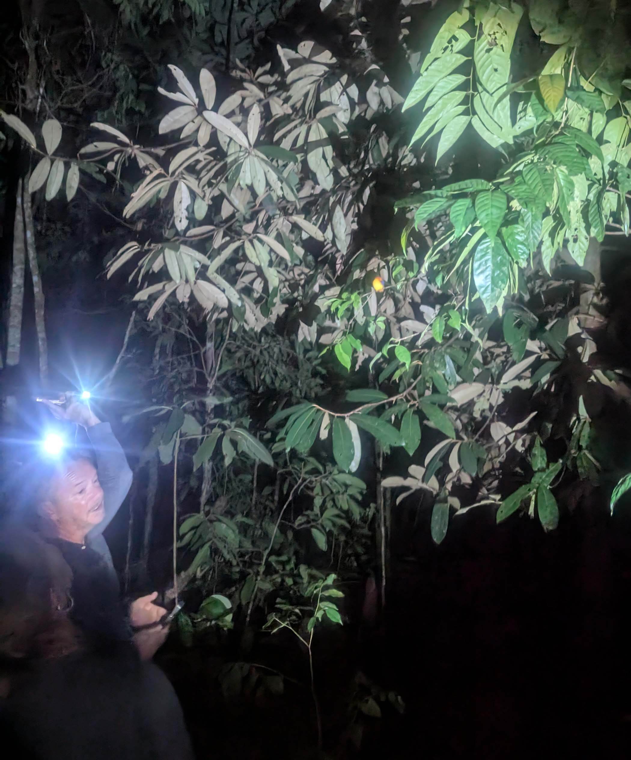 Hardy took us on a night walk through the jungle. It was hard – we were going up and down steep, slippery, narrow trails. There were sometimes railings made of rope, although one of them we were warned “don’t use this one – it has fire ants on it.”